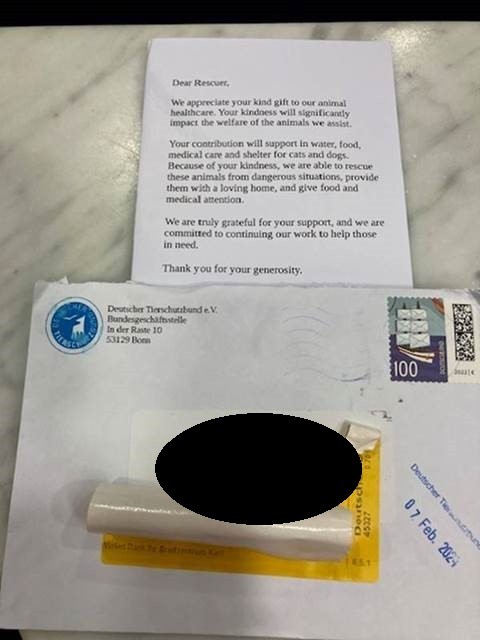 Derzeit werden mit Absender des Deutschen Tierschutzbundes Briefe verschickt, in denen in englischer Sprache um Spenden zur Rettung von Tieren gebeten wird. Das Logo und die Anschrift des DTB sind auf den Umschlägen aufgedruckt, so dass die Briefe auf den ersten Blick echt wirken können. Die Briefe enthalten außerdem teilweise Tabletten oder weißes Pulver und es ist noch nicht klar, ob diese eine Gesundheitsgefährdung darstellen. Öffnen Sie die Briefe daher auf keinen Fall!