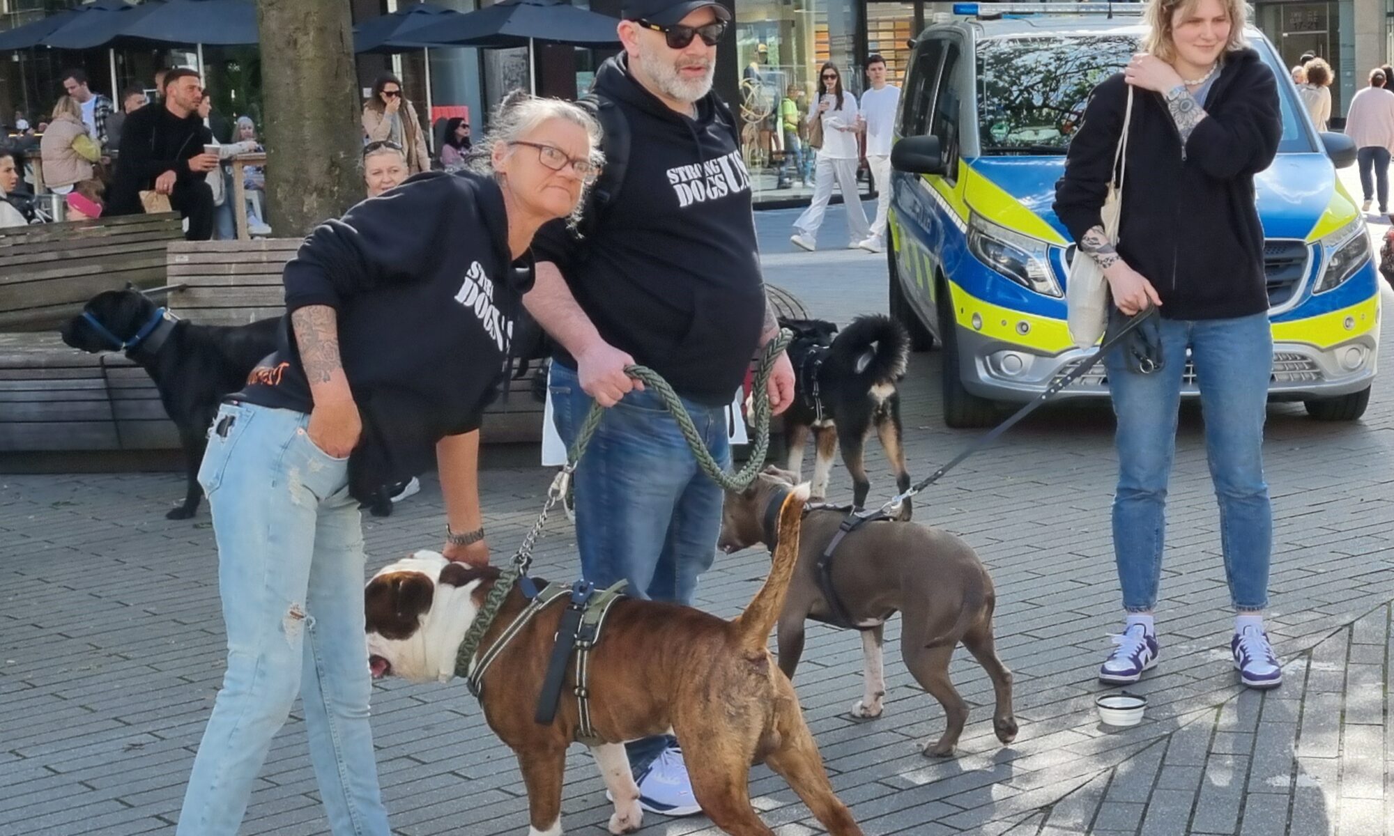 fand am Samstag bei schönstem Wetter statt und zog neben rund 150 Menschen mit Hunden auch viele Passanten an, die sich über das Thema informierten. Und die als so böse verschrieenen Hunde haben gezeigt, wie toll sie sind. Gute Sozialisierung, Haltung und Erziehung vorausgesetzt – was ja aber für alle Hunde gilt! Deshalb plädieren wir für Halterkunde (in Theorie und Praxis) um wirklich Gefahren vorzubeugen, statt lediglich durch unsinnige Rasselisten unschuldige Hunde zu diskriminieren. Die Hunde auf der Demo haben sich durchweg vorbildlich verhalten. Kleine Kläffer am Straßenrand wurden ganz cool von ihnen ignoriert und auch untereinander gab es keinerlei Ärger. Menschen gegenüber zeigten sich alle wohlerzogen, freundlich bis verschmust und einfach nur großartig.