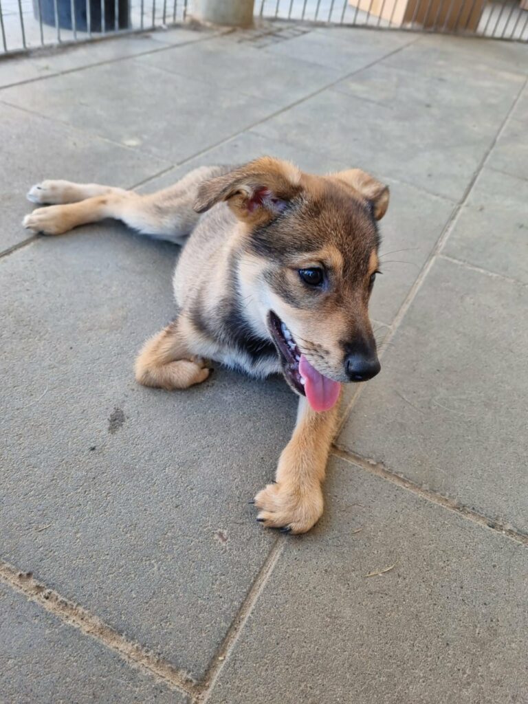 Diese kleine Maus haben wir wegen Überforderung übernommen. Wir haben Sie „Hope“ getauft, weil sie voller Hoffnung und Lebensfreude ist. Wenn man sich die Bilder einmal anschaut, sieht man, dass sich ihre Vorderbeine nicht richtig entwickelt haben. Aber dadurch lässt Hope sich nicht beeindrucken. Welpen typisch spiet und tobt sie durch de Gegend. Aber natürlich wissen wir, dass sie Schmerzen hat, denn durch die Deformierung ihres Fußes der ihr ermöglicht zu laufen, hat sie Schwierigkeiten mit dem Gleichgewicht.