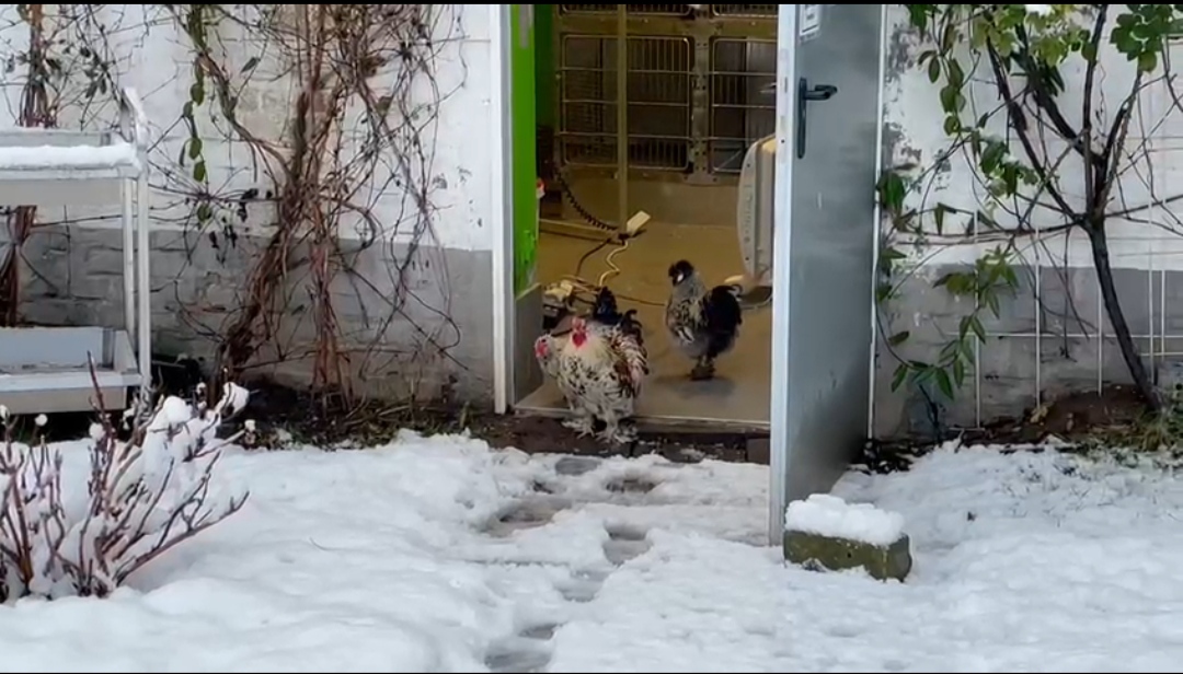 Aber unsere Hühner waren nicht amused. Weißes Zeug an den Füßen? Ohne uns! Der Morgenspaziergang musste ausfallen. Der Wille war zwar da, aber nur bis zur Türschwelle. Dann wurde umgehend der Rückwärtsgang eingelegt und geschmollt.
