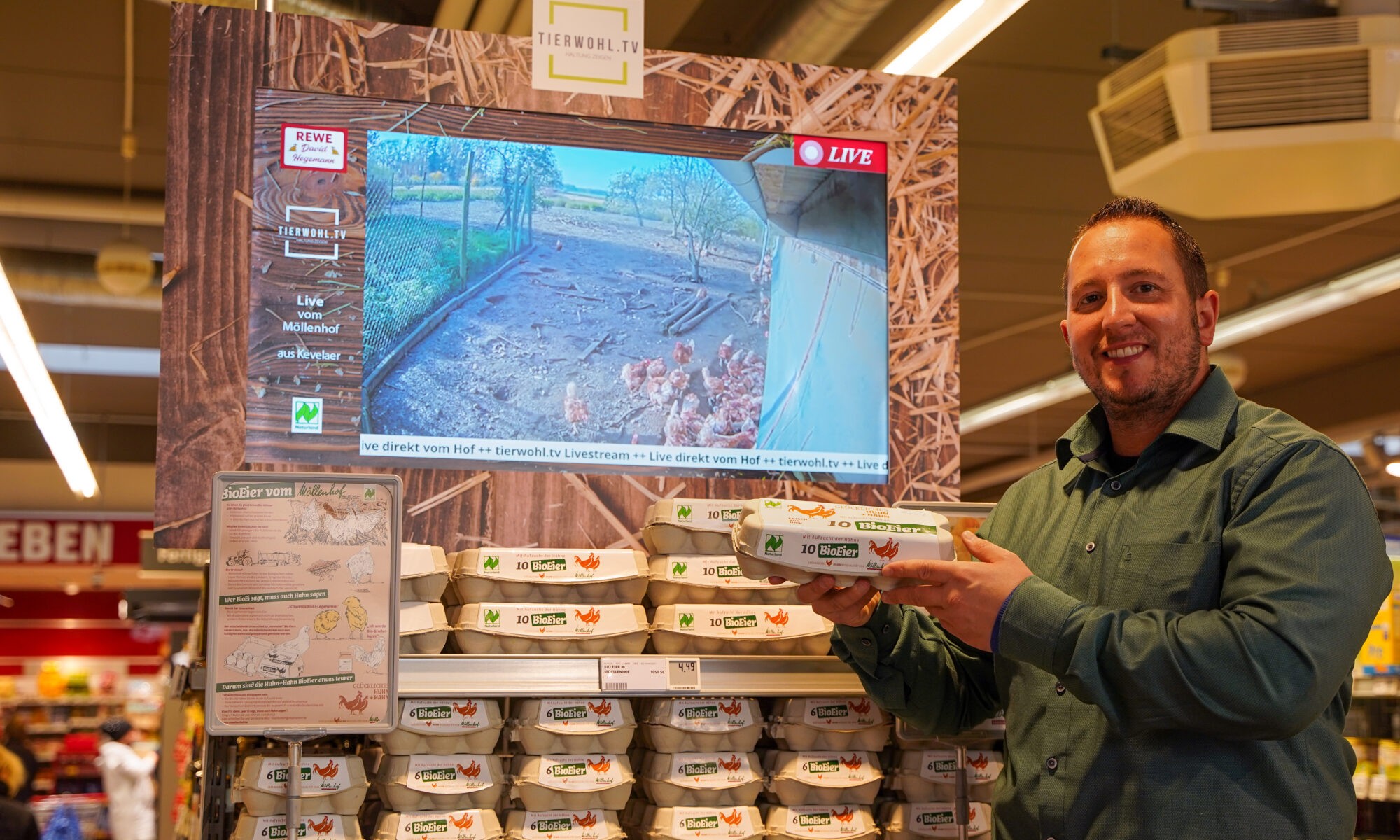„Immer mehr Endverbraucher beschäftigen sich mit der Herkunft und Qualität der von ihnen konsumierten Lebensmittel. Sie wünschen sich eine artgerechte und ressourcenschonende Haltung der Tiere. Seit über 60 Jahren haben wir, die Familie Werner, Erfahrung in der artgerechten Haltung von Hühnern und gehen mit diesen respektvoll und behutsam um. Zahlreiche Menschen haben sich schon auf unserem Möllenhof davon überzeugt. Tierwohl TV bietet nun einen dauerhaften Einblick in das Hühnerleben auf unserem Hof – direkt beim Einkauf im REWE-Markt“ erklärt Jörg Werner.