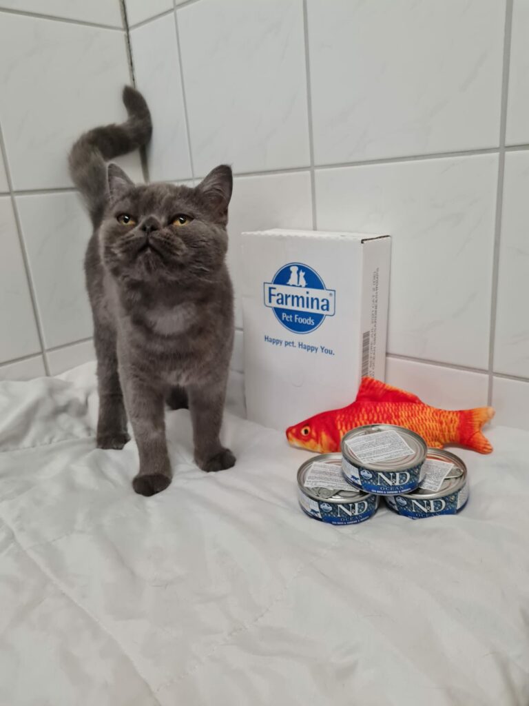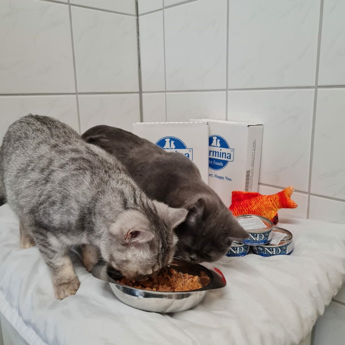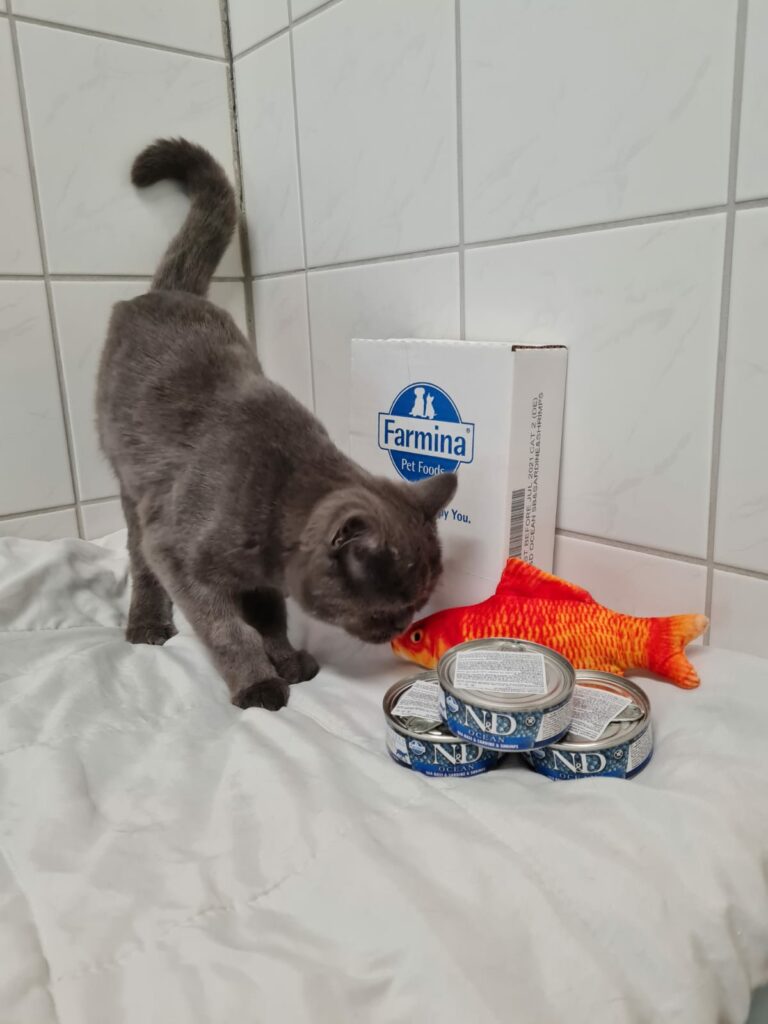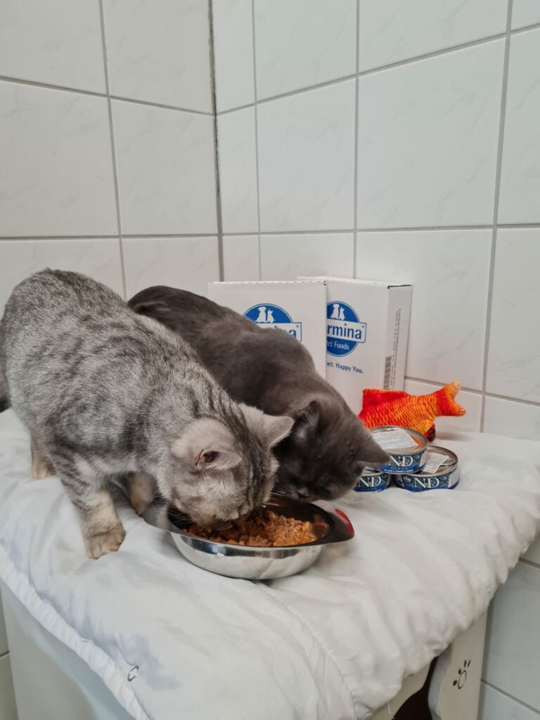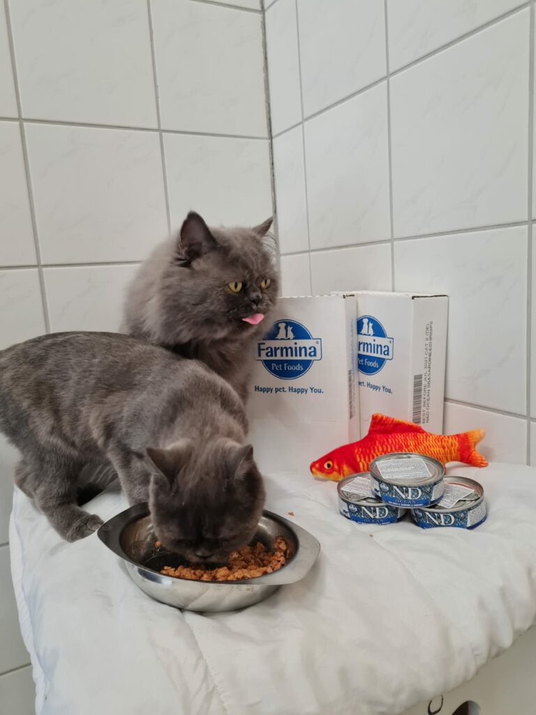 Wie man unschwer erkennen kann, lassen sich unsere Samtpfoten das Futter der Firma Farmina schmecken. Eine große Spende erreichte uns die Tage und ist heiß begehrt. 4320 (!) Döschen mit feinstem Fisch sind genau das richtige für unsere Katzen! Es schmeckt ihnen so gut, dass sie auch den extra für die Fotos dazugelegten Goldfisch kaum eines Blickes würdigen.