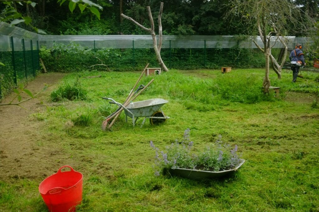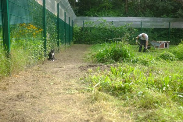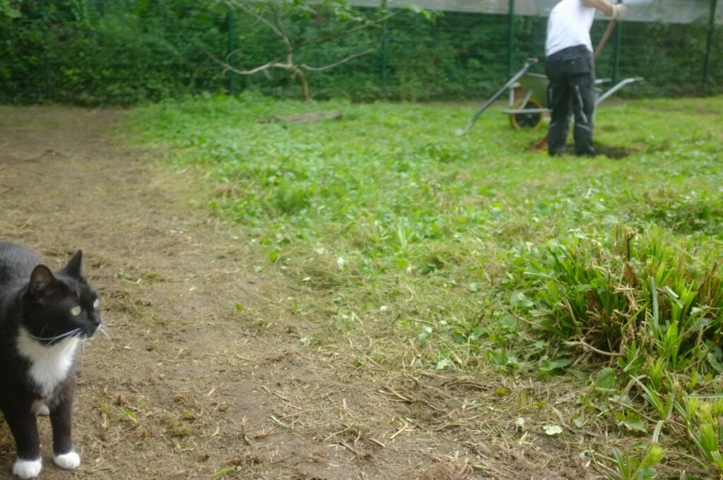 Wir sind zwar ausgesprochene Fans von etwas wilderen Gärten (sind ja auch tierfreundlicher), aber dennoch mussten wir mal den Katzengarten bearbeiten. Das Gelände war sehr unwegsam, alles wucherte mit Brombeeren und Brennnesseln zu und die Mitarbeiterinnen hatten so ihre Schwierigkeiten zwischen den Tretminen der Katzen eben diese zu entfernen, ohne sich die Haxen zu brechen.
