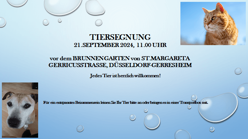 Es ist wieder so weit: die inzwischen so beliebte Tiersegnung in Gerresheim findet dieses Jahr am 21.September um 11.00 Uhr statt. Wie immer auf dem Vorplatz des Brunnengartens neben der schönen Basilika St.Margareta, werden alle mitgebrachten Tiere von Monsignore Oliver Boss gesegnet. Unser Team Gassi ist natürlich auch wieder mit einigen Tierheimhunden dabei.