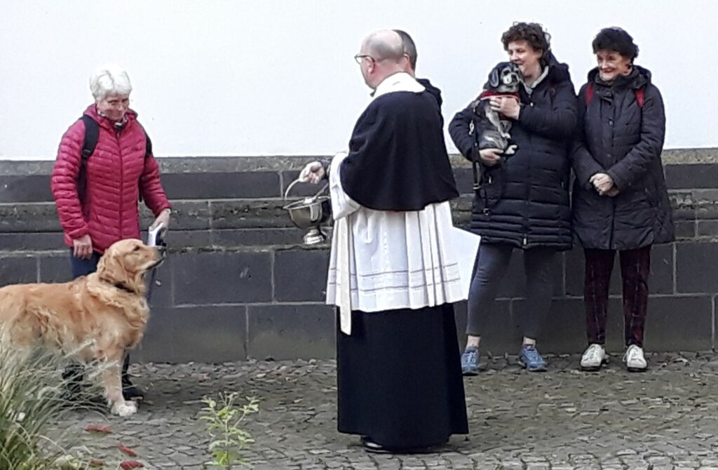 Bei der anschließenden Segnung nahm sich Pastor Boss die Zeit, mit den Hundebesitzern ein paar Worte zu wechseln, die natürlich gerne von ihren Tieren erzählten. Es war auch wieder alles vertreten: vom Welpen bis zum steinalten Senior, vom Winzling bis zum Riesen, vom Rassehund bis zum „Alles-drin“. Rund 80 Hunde waren da, so viele, dass zwischendurch eine zweite Ladung Weihwasser geholt werden musste, damit auch alle ihren Segen bekommen konnten.