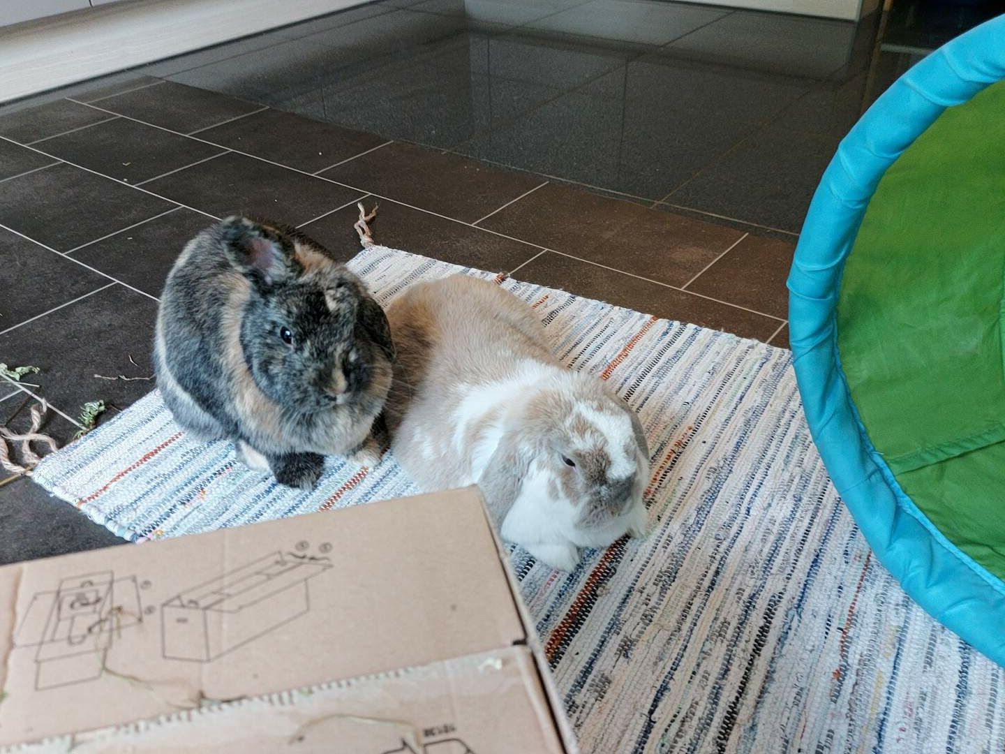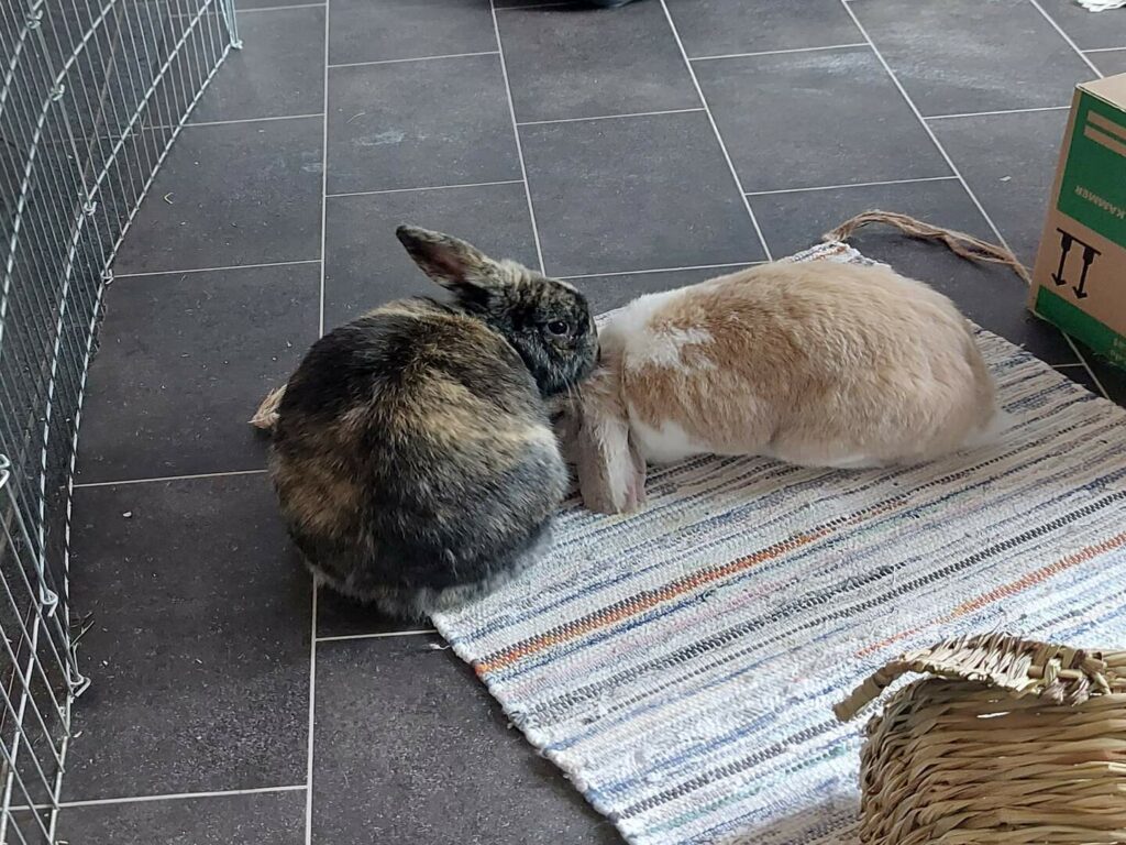 Die Vergesellschaftung war sehr entspannt. Am Samstag haben zwar beide ordentlich Fell gelassen, aber die Auseinandersetzungen waren sehr kurz und recht harmlos. Gegen Abend war schon klar, dass Rocky sich durchsetzt und Lina sich unterwirft. Seitdem nähern die beiden sich Tag für Tag immer mehr an. Sie fressen und schlafen schon nebeneinander und am Dienstag haben sie sich das erste Mal gegenseitig geputzt.