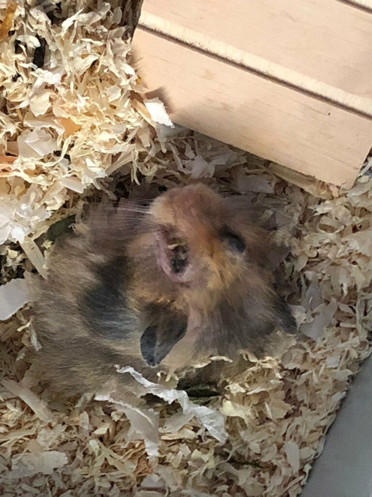 UPDATE 22.09.: Das Hamsterchen ist völlig abgemagert und das rechte Ohr und linke Auge sind hochgradig eitrig entzündet und es hat schuppige Haut. Ob es der kleine Kerl schafft ist leider fraglich.